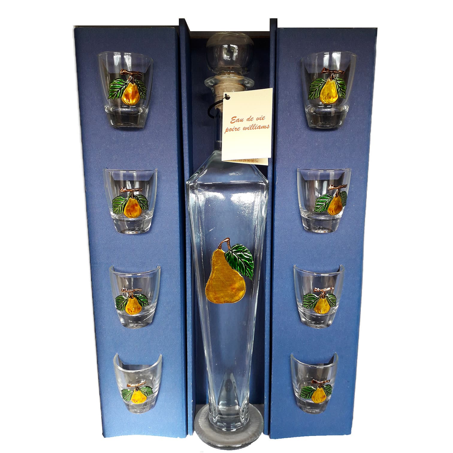 Coffret « Eclipse » 50 cl d’eau de vie de poire Williams à 45 % vol + 8 verres avec étiquette étain